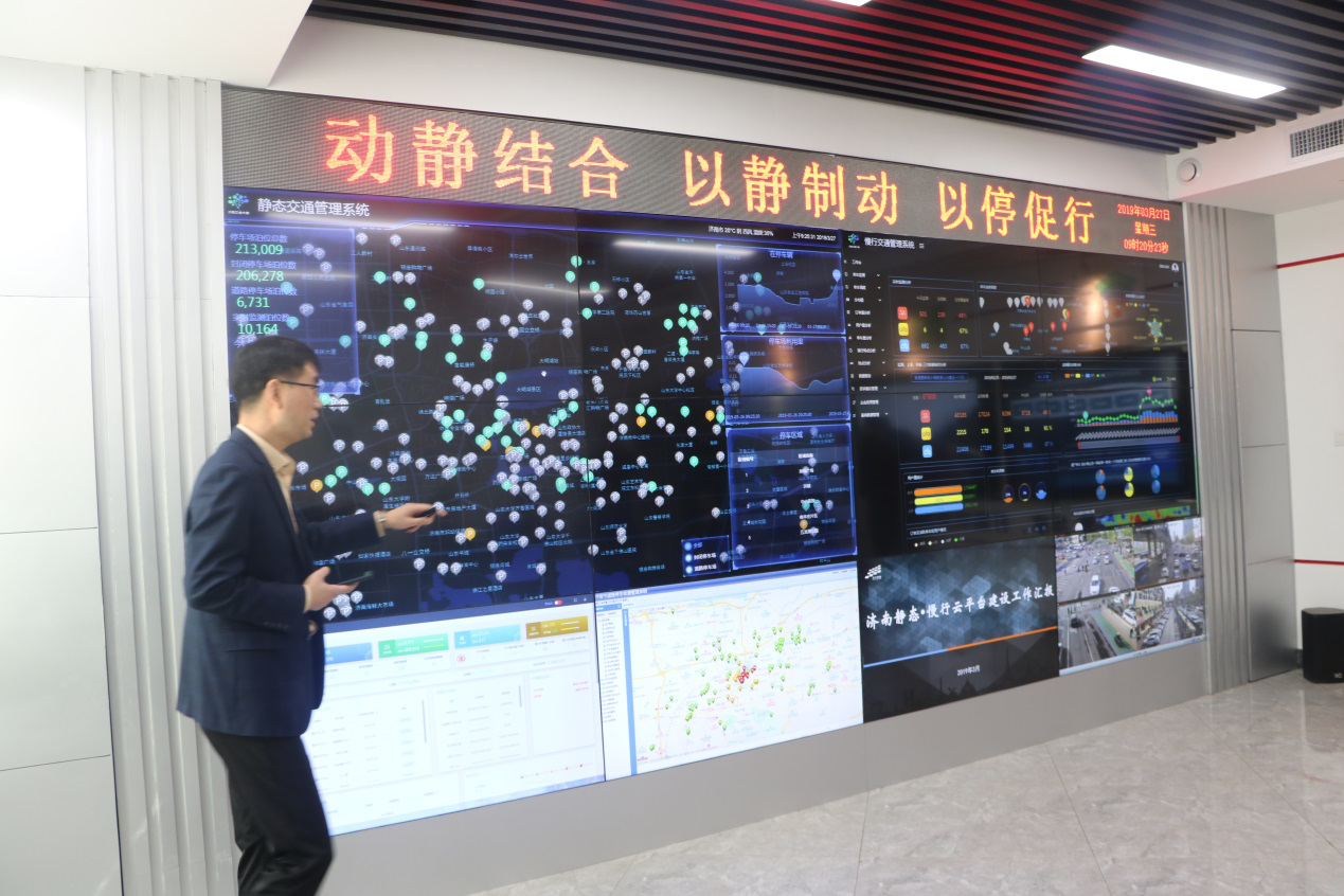 大家首先參觀了七樓數(shù)創(chuàng)中心。“城市交通大腦”及智慧停車平臺,“一云四中樞”智能交通總體架構(gòu),對接交通運輸、氣象等部門管理數(shù)據(jù),匯入滴滴、高德等互聯(lián)網(wǎng)企業(yè)數(shù)據(jù),構(gòu)建動態(tài)交通感知大數(shù)據(jù)資源池,為聚力打造的泉城智能交通管理新生態(tài)。